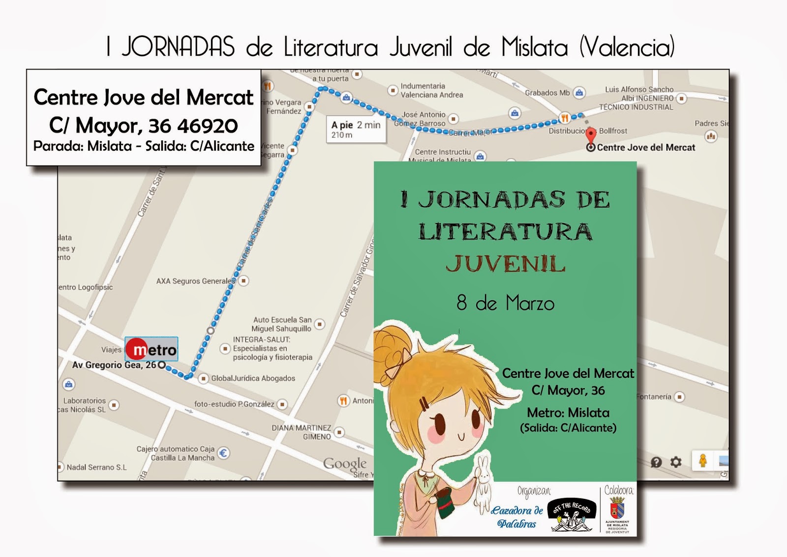 Maite Belda , administradora del blog Cazadora de palabras y Patricia Madrid junto a la revista literaria Off the Record, se complace en invitaros a las primeras jornadas de literatura  juvenil que tendrán lugar el día 8 Marzo en  El centre jove del mercat de Mislata.